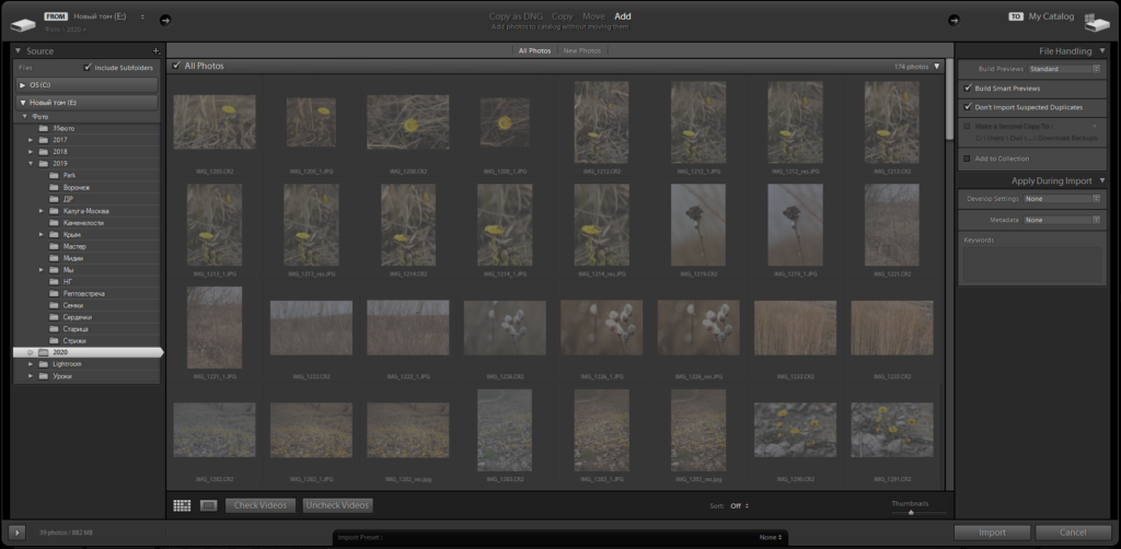1. Чтобы работать с фотографиями в Lightroom, их нужно сначала добавить в его библиотеку. Это несколько отличается от логики DPP, где достаточно было просто выбрать каталог файловой системы и работать непосредственно в нём. На самом деле модуль Library очень удобен, просто к нему нужно привыкнуть. Он позволяет в несколько кликов добавлять уже существующие каталоги, не трогая файлы, либо копировать или перемещать их с внешнего носителя. За это отвечают различные режимы в модуле Import – Add, Copy и Move.